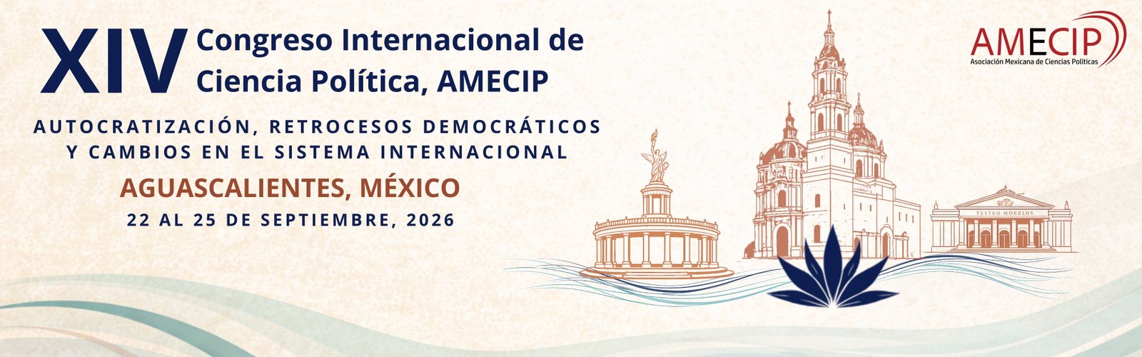 La Asociación Mexicana de Ciencias Políticas (AMECIP) y la Universidad Autónoma de Aguascalientes (UAA), a través del Centro de Ciencias Sociales y Humanidades y el Departamento de Ciencias Políticas y Administración Pública, en colaboración con la Fundación Konrad Adenauer (KAS) y el Instituto Nacional Electoral (INE) convocan al XIV Congreso Internacional de Ciencia Política, que se realizará en la modalidad virtual el 22 de septiembre y de manera presencial los días 23, 24 y 25 de septiembre de 2026, en las instalaciones de la Universidad Autónoma de Aguascalientes, Aguascalientes, México.